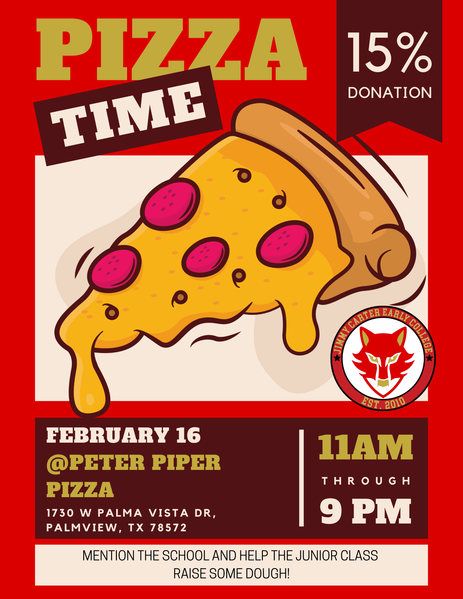 The class of 2024 is partnering up with Peter Piper Pizza at Palmview to raise some “dough.” Go to the location on February 16 between 11 a.m. and 9 p.m. Don’t forget to mention Jimmy Carter ECHS for 15% of the funds to go to the junior class!