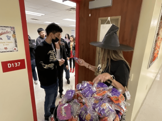 Mrs. Hernandez goes around the school to give candy on Halloween