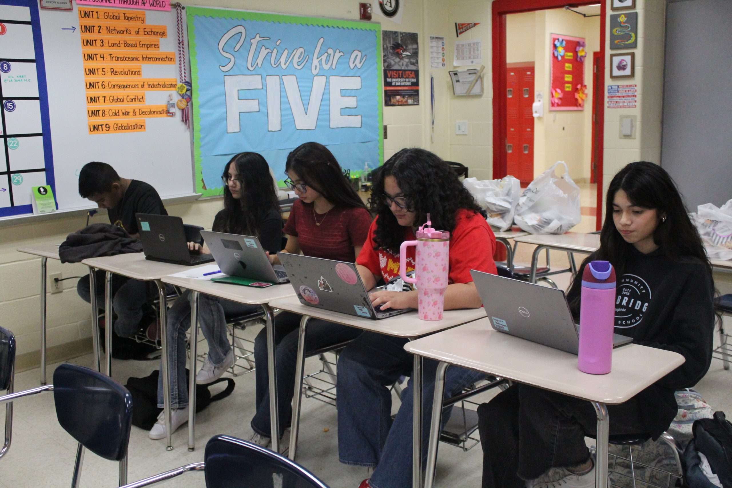 Five students stay focused on their individual assignments, each giving their full attention and effort to the task in front of them....