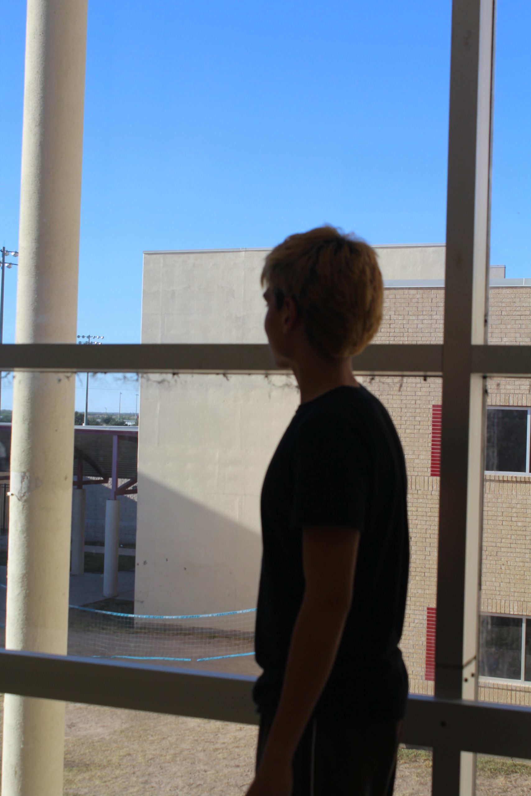 On his way back to class, a student pauses by the window, taking in a quiet moment before stepping back into the busy school day....