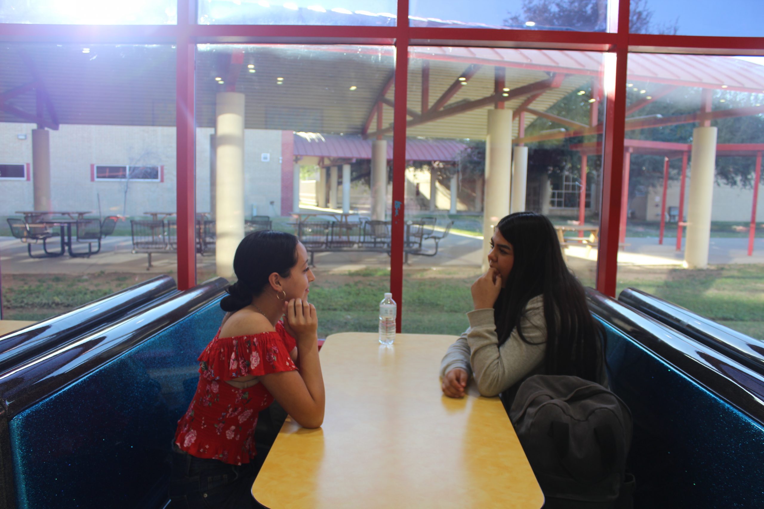 Two students share a quick chat in the cafeteria booth, enjoying a calm moment together before heading back to their day....