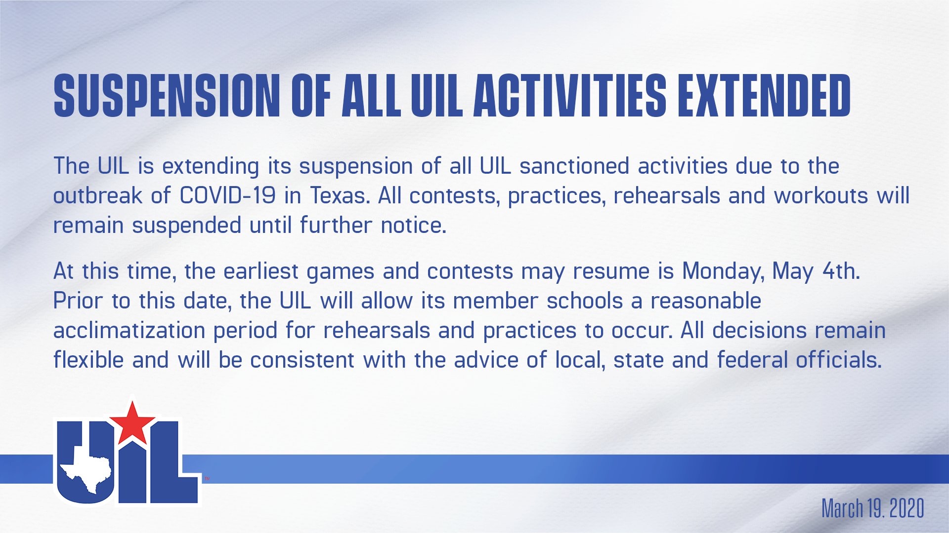 UIL Announces Extended Suspension of All UIL Activities
