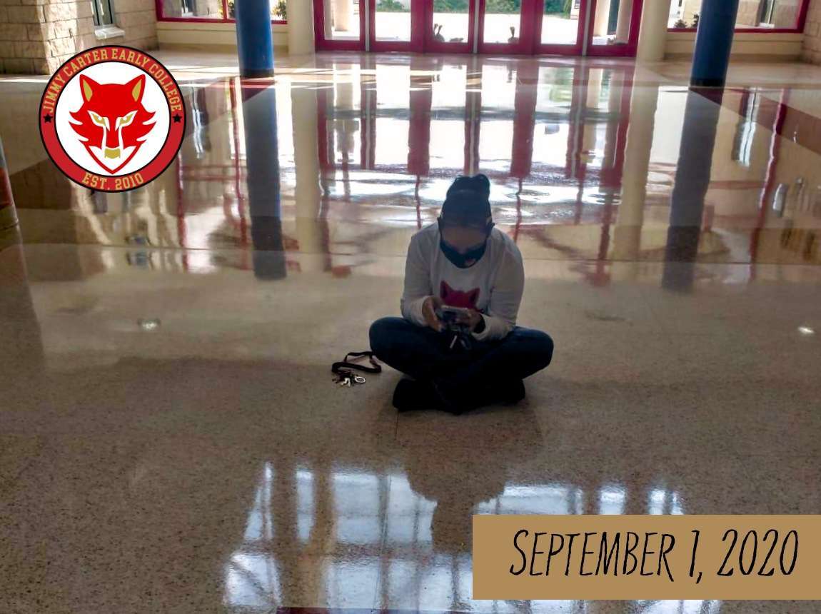 Rewind: Principal Claudia Gomez-Perez sits alone in the student union area, marking the start of the 2020-2021 school year with remote learning. This quiet beginning for the class of 2024 starkly contrasts the school’s typically busy atmosphere.