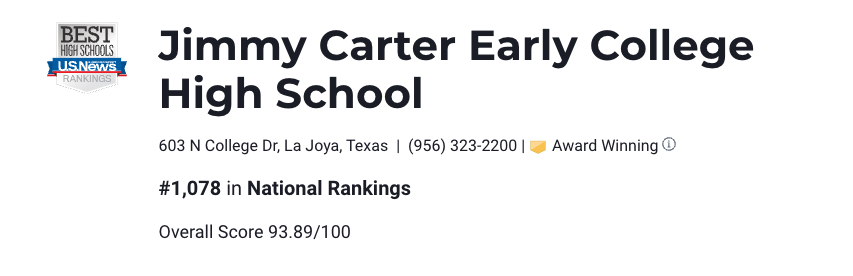 Jimmy Carter Early College High School earned high National and metro-area rankings in 2024 Best High Schools, which U.S.Here is your school’s updated U.S.