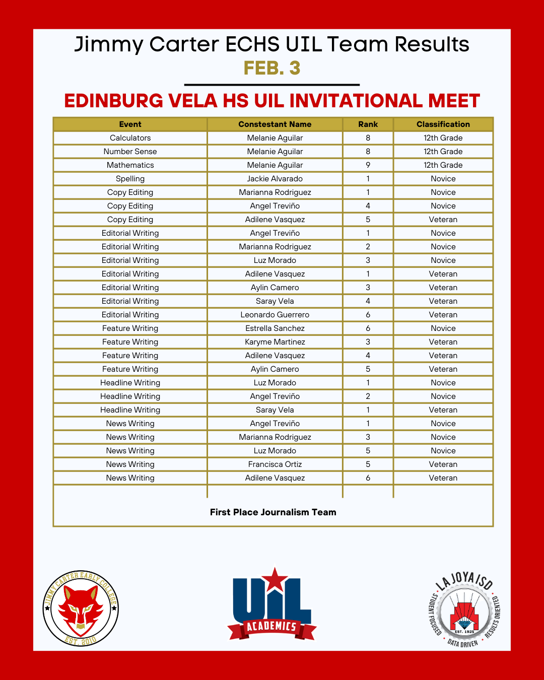 The Jimmy Carter, ECHS UIL Academics team, displayed exceptional talent at the Robert Vela High School UIL Invitation on Feb. 3. 🌟 #UILAcademics #RedWolves