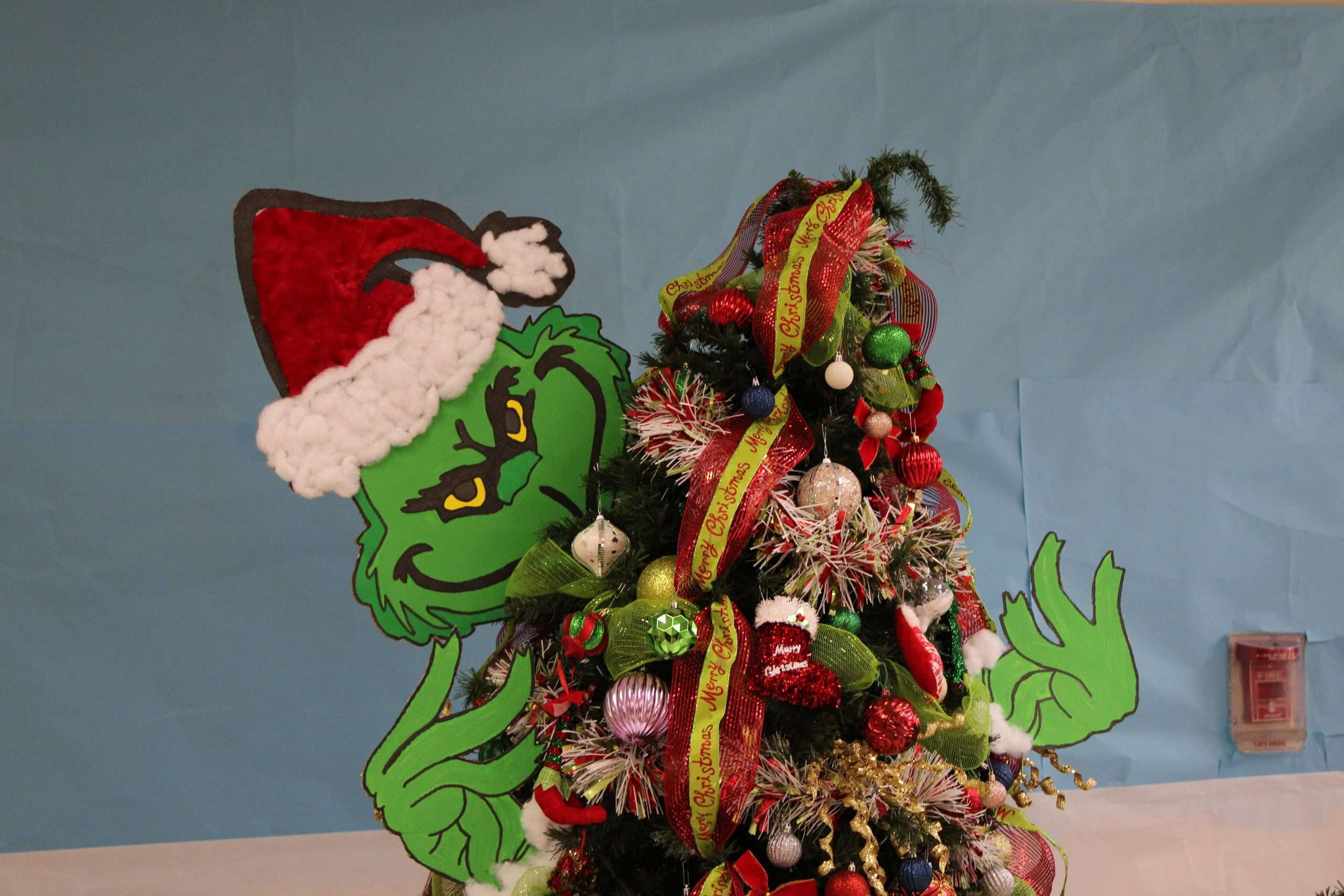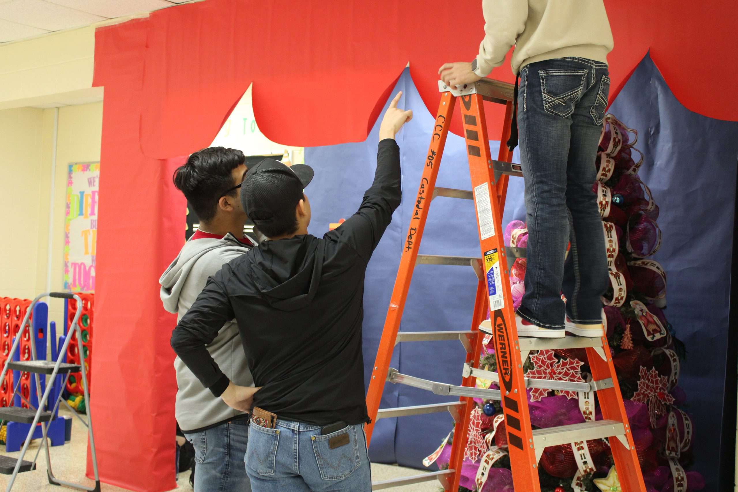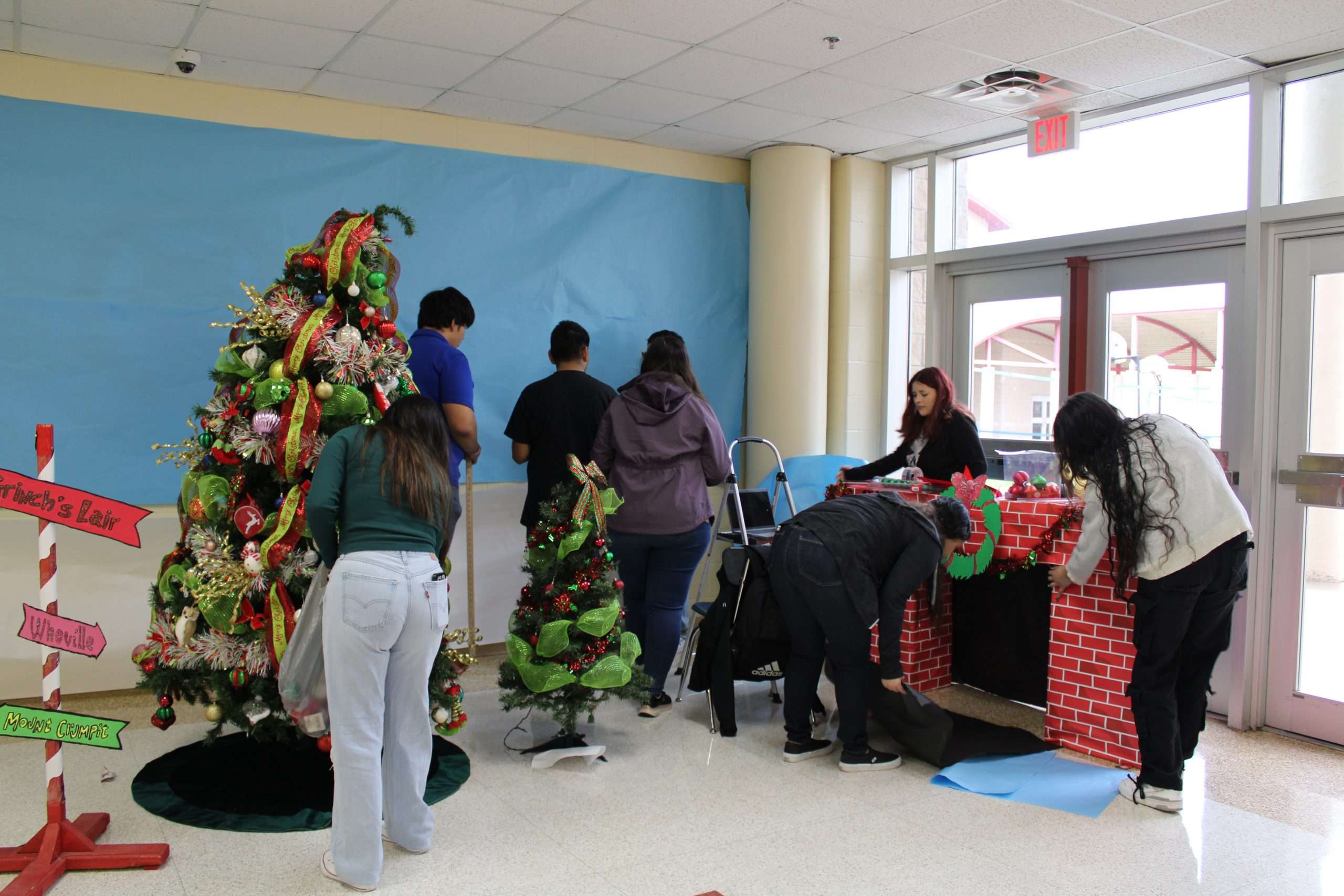Students engage in a festive project, decorating the school hallways and setting up trees for each grade level.
